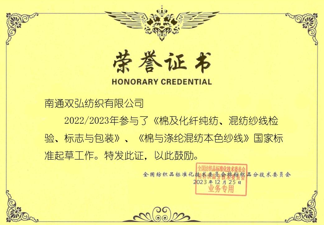 En tant qu'unité adjointe du secrétaire général du Comité technique national pour la normalisation des textiles de coton et une unité membre du comité technique pour la normalisation du Conseil national de textiles et de vêtements de Chine, Double Great Company participe activement à des activités de normalisation, participe à la formulation et à la révision de diverses normes, prend l'initiative Entreprendre la rédaction et l'examen des normes, et présente de nombreuses opinions précieuses. Certaines suggestions innovantes ont été adoptées et solidifiées, devenant la version principale de la rédaction standard. Double grande entreprise a successivement formulé 3 normes nationales, 11 normes de l'industrie, 4 normes de groupe, et 3 Normes de consommation d'unité commerciale de traitement des douanes et a remporté le titre de l'unité nationale avancée pour les normes de l'industrie textile et Entreprise nationale avec des contributions exceptionnelles à la normalisation textile.
